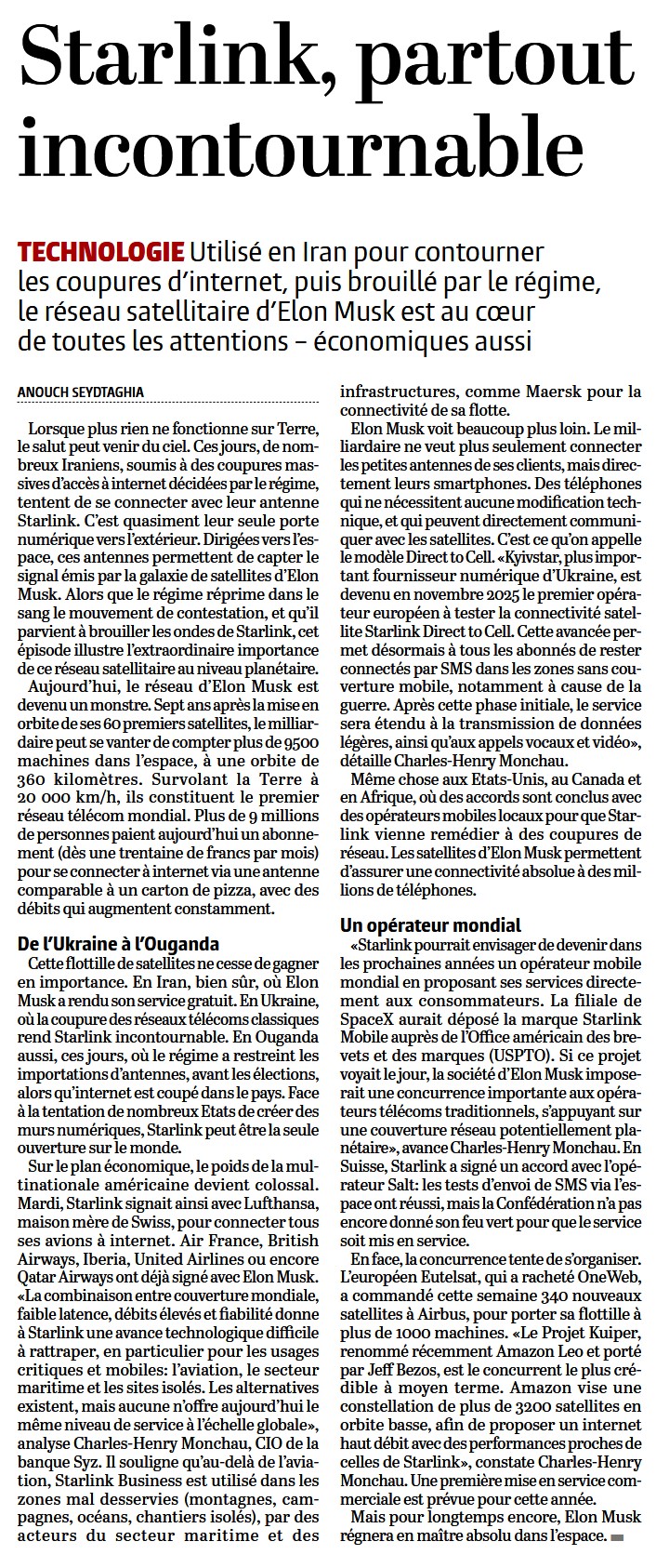 Un récent article dans le journal Le Temps a mis en exergue l’importance géostratégique de la constellation satellitaire Starlink et des dangers que ce réseau représente.